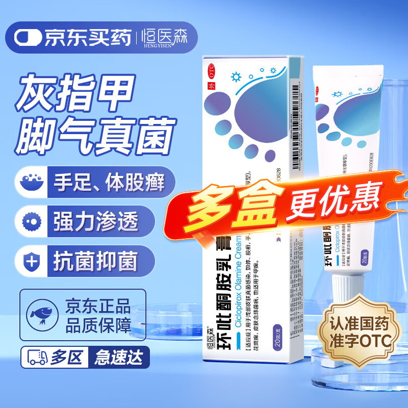 恒医森 环吡酮胺乳膏1%*20g灰指甲专用药脚气药止痒脱皮烂脚丫抗真菌感染软膏抑菌杀菌皮肤用药体股手足癣
