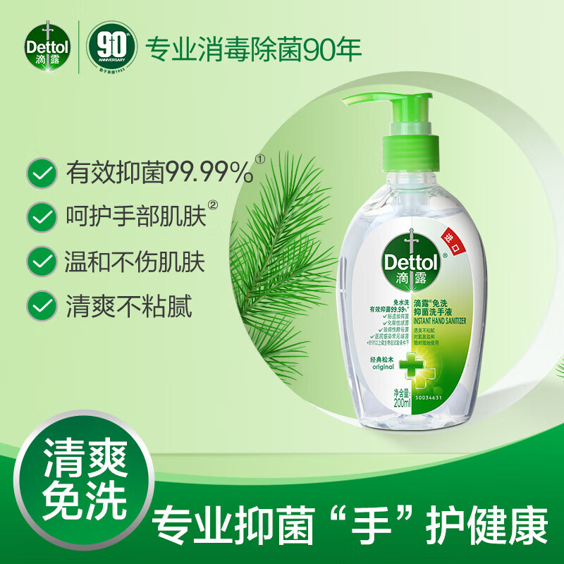 滴露(Dettol)滴露免洗洗手液 抑菌消毒免水洗洗手液便携 免洗手消毒液 含酒精 【松木200ml】