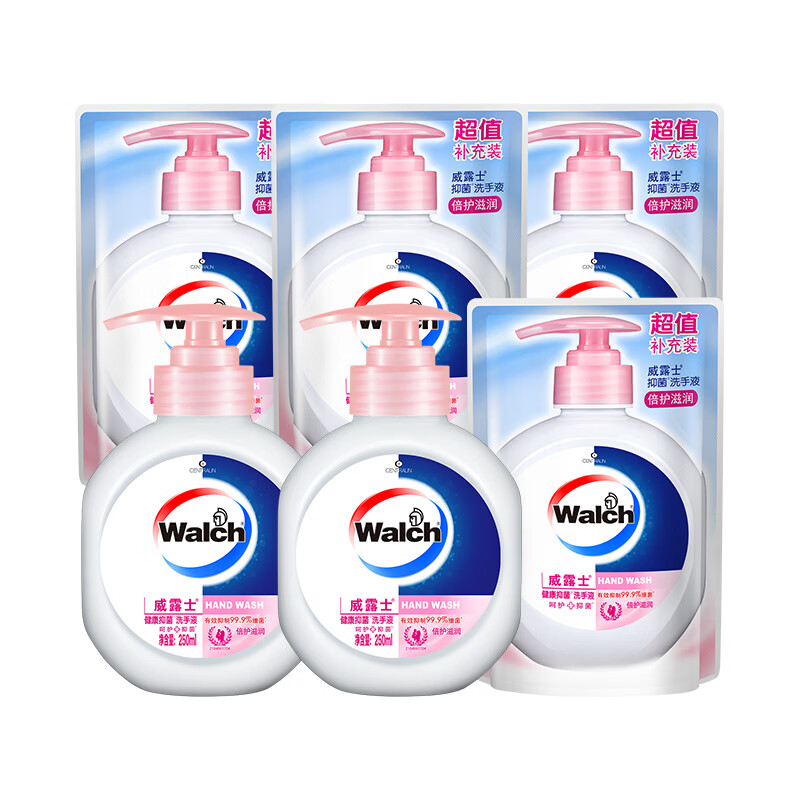 威露士(Walch)健康抑菌洗手液250ml*2瓶+补充装4袋 小瓶便携家用 有效抑菌99.9% 倍护滋润250ml*2+袋装250ml*4