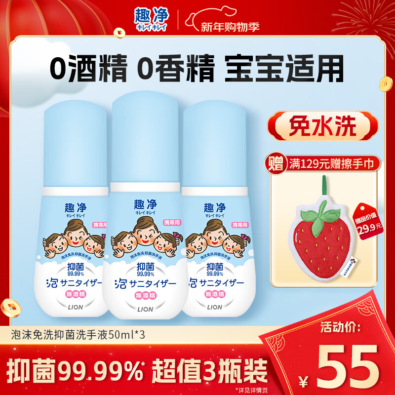 狮王(Lion)趣净泡沫免洗抑菌洗手液50ml*3无需水洗方便携带抑菌呵护儿童