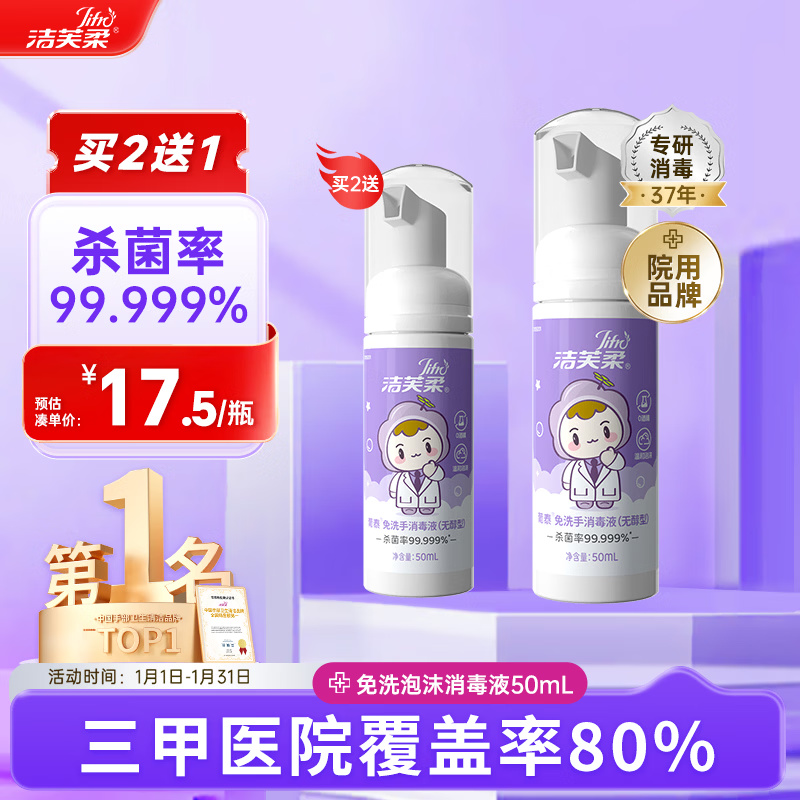 洁芙柔免洗洗手液50mL 无醇泡沫无酒精免洗手消毒液便携杀菌儿童抑菌
