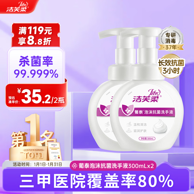 洁芙柔葡泰泡沫洗手液300mL*2 抗菌杀菌消毒医用泡泡儿童抑菌补充装