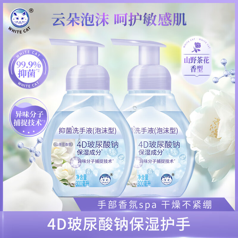 白猫泡沫洗手液京东官方补充装抑菌非免洗儿童大桶装替换装天然成分 2瓶-600ml【致敏率0%】