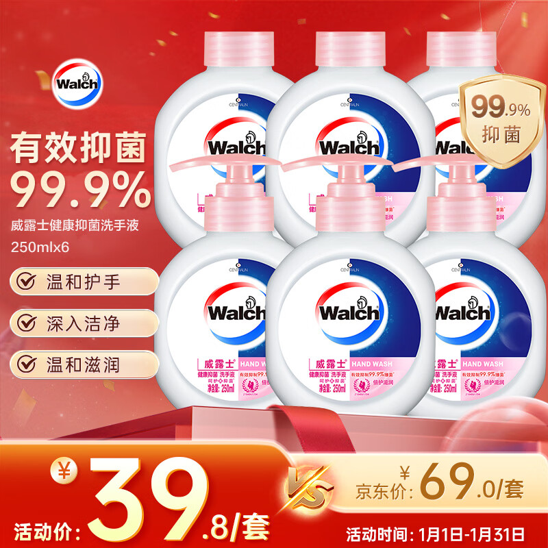 威露士健康抑菌洗手液250ml*6瓶 补充装儿童家庭装滋润抑菌99.9%