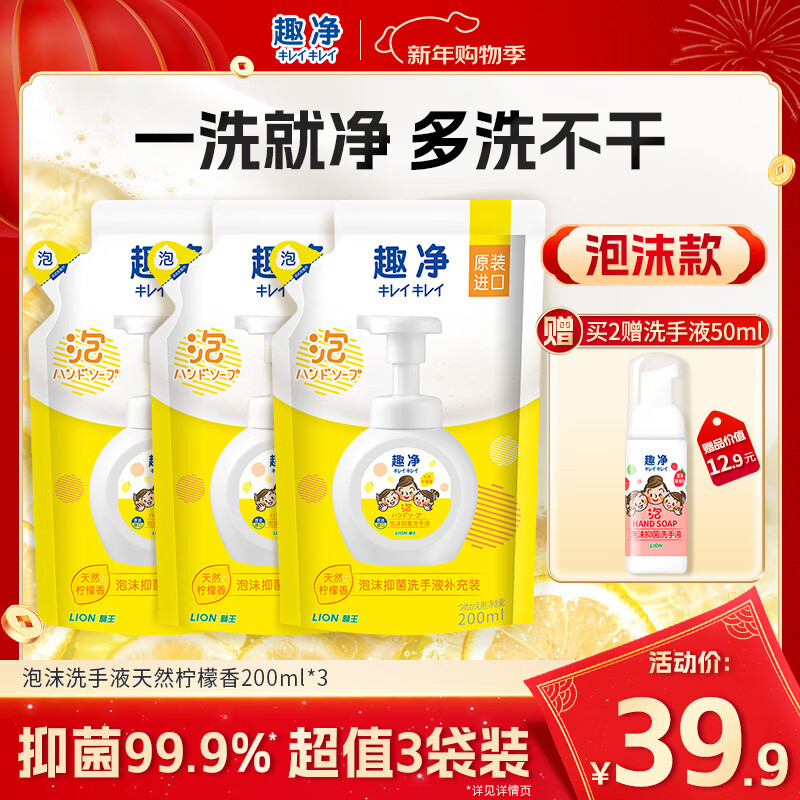 狮王(Lion)趣净泡沫抑菌洗手液天然柠檬香200ml*3补充装绵密泡沫儿童
