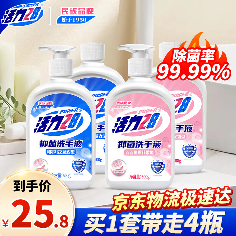 活力28抑菌洗手液500g*4瓶(橙花*2+帕尔玛*2)手部清洁家庭替换补充装