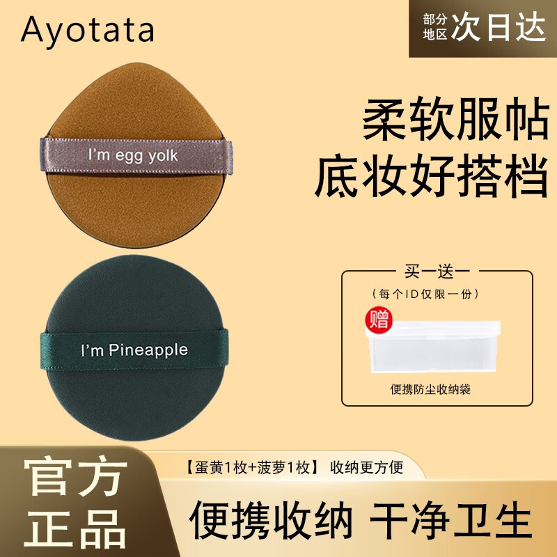 Ayotata气垫粉扑气垫BB替换粉扑粉底液散粉多用干湿两用菠萝粉扑不易吃粉 蛋黄 1枚 +菠萝1枚 收纳盒装