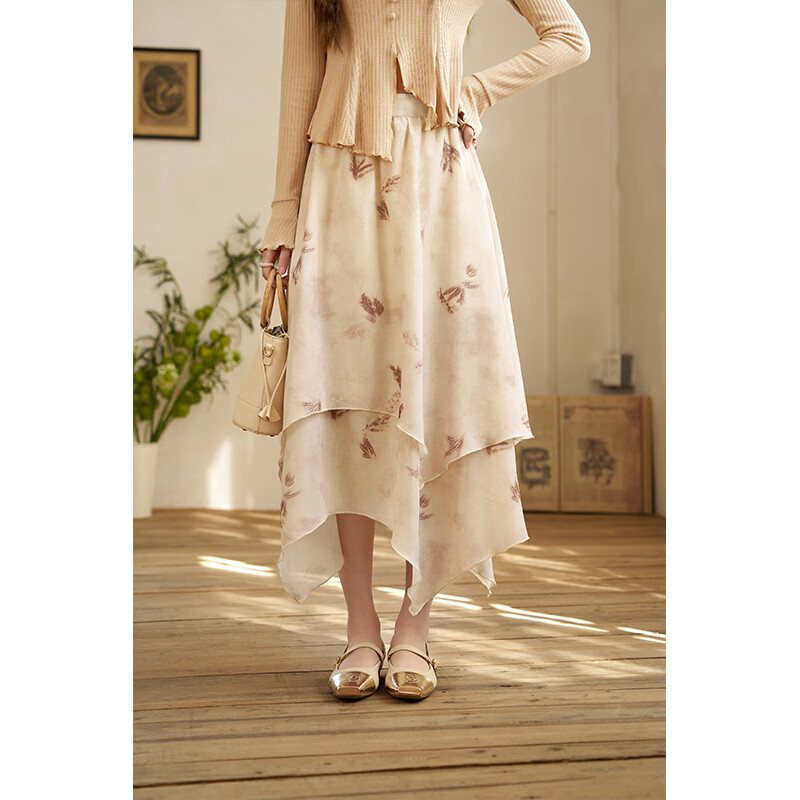 谜秀设计感不规则半身裙女装2025春秋季新款腰显瘦A字裙花长裙 杏色 半身裙 M