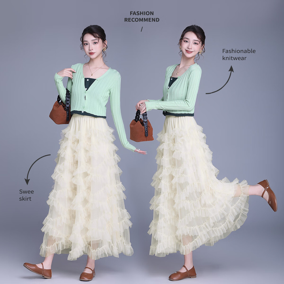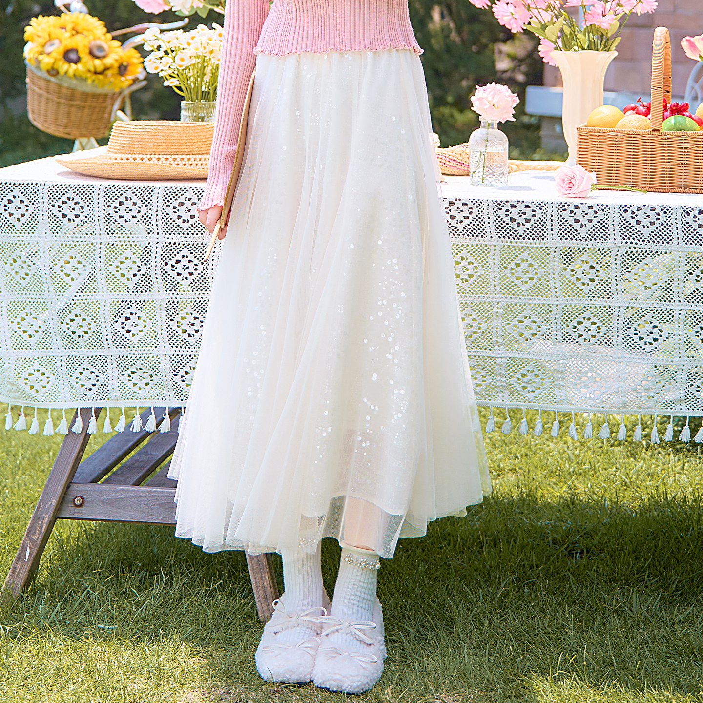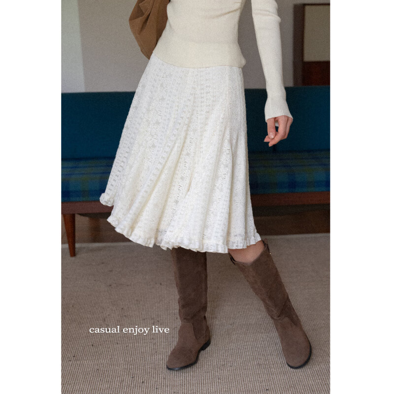 森女部落甜美白色a字针织半身裙女秋冬百搭荷叶边裙摆高腰蛋糕裙 米杏色半裙 L