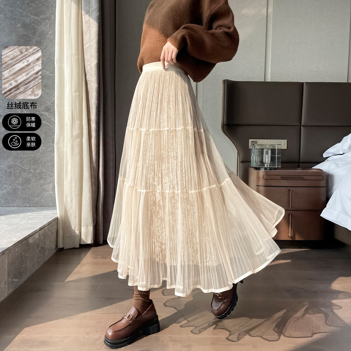 妃衣度(FYDOUL)半身裙秋冬大码加厚毛绒绒女高腰蕾丝蛋糕裙胖MM遮肚子显瘦裙子 杏色 XL (建议120~140斤)