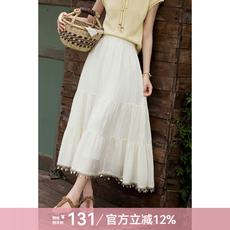 谜秀莱赛尔肌理A字半身裙2025夏季新款松紧腰贝壳织带显瘦垂感中长裙 杏色 M