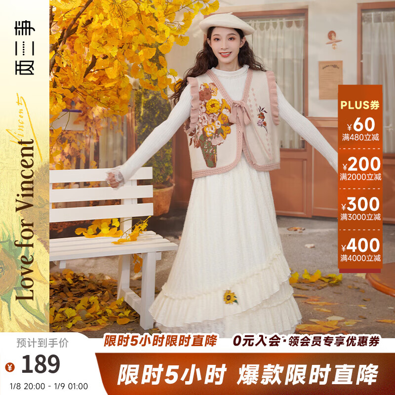 两三事梵高白色半身裙新款绝美秋装女款裙子蕾丝蛋糕半裙蓝鸢仙葵 杏色 M