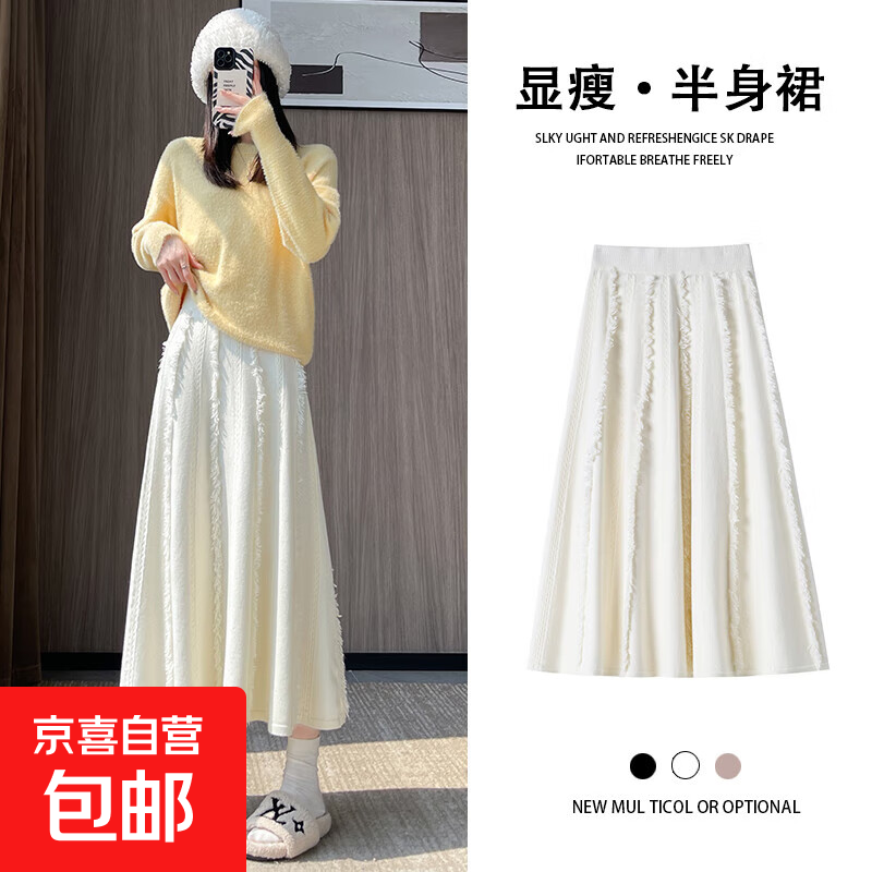 斤慕奶fufu白色流苏针织半身裙女春秋冬宽松垂感长大摆伞裙高腰a字裙 流苏半身裙杏色均码建议85-150斤