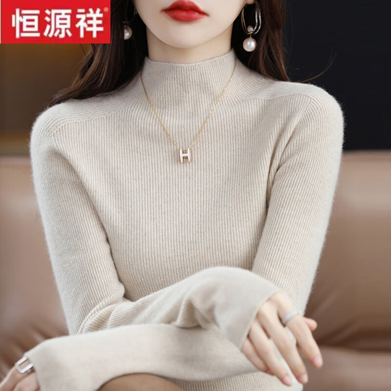 恒源祥羊毛衫女秋冬加厚打底毛衣修身内搭半高领针织衫 杏色 L 建议110-120斤