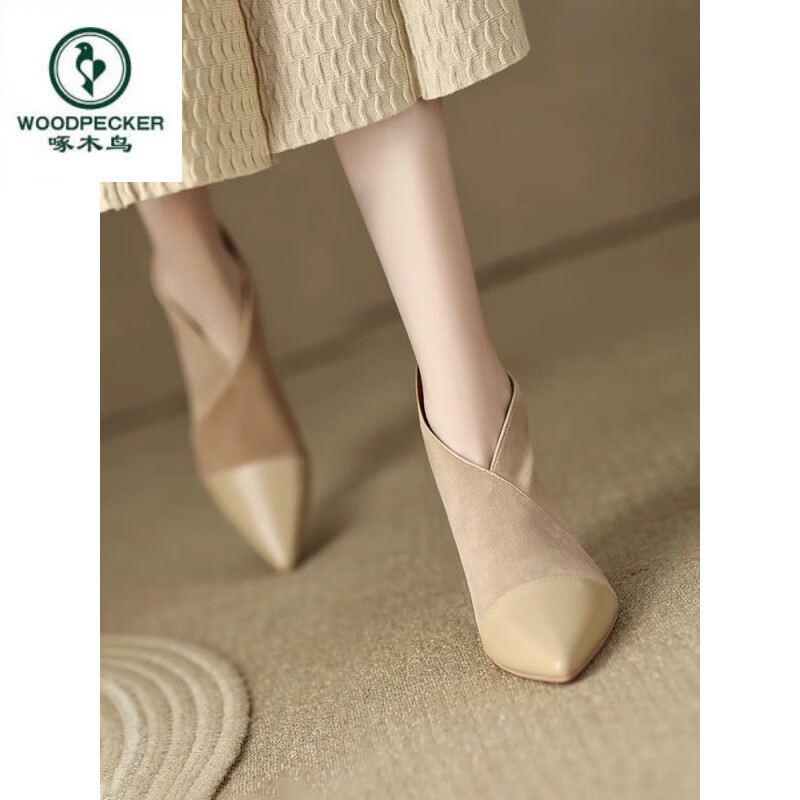 啄木鸟羊皮法式小踝靴短靴感尖头细跟单鞋小众裸色高跟鞋真皮靴子女 杏色绒里 39