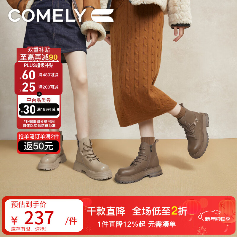 千百度(C.BANNER)厚底马丁靴女冬款大黄靴美拉德短靴女鞋A23536303 杏色 37