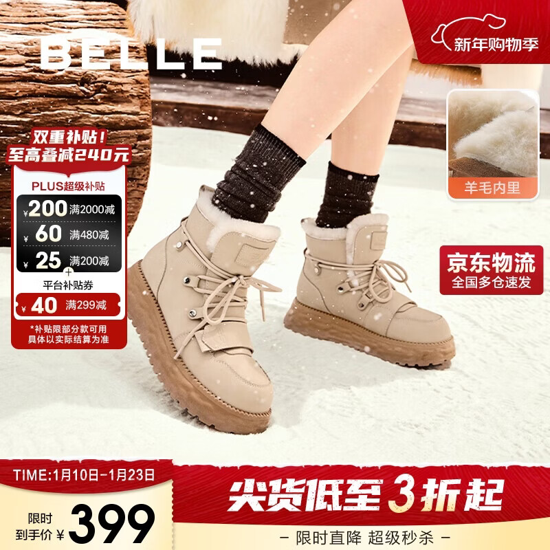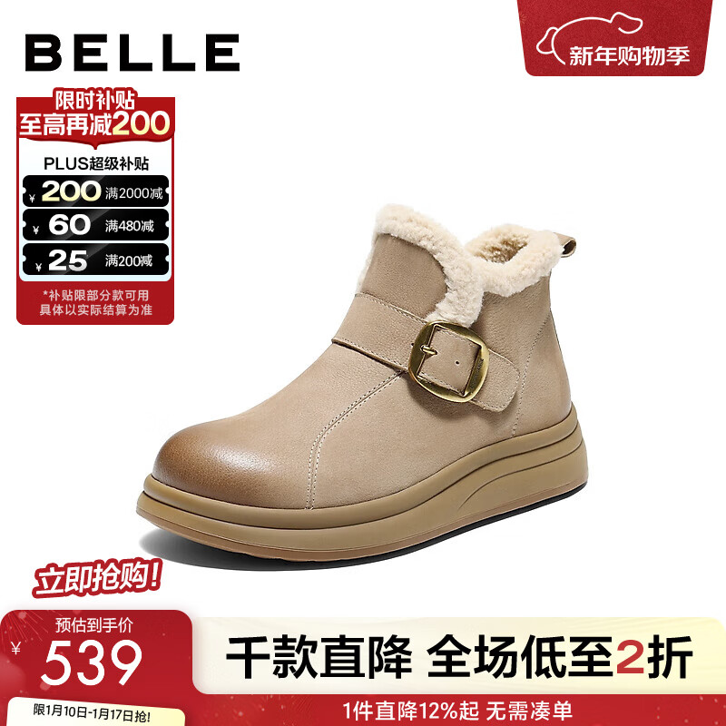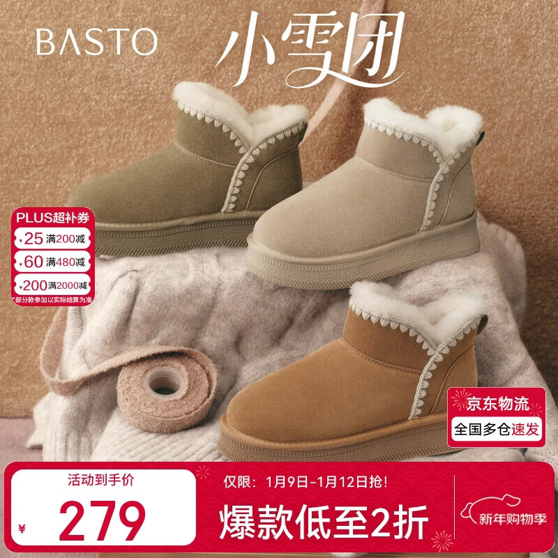 百思图2025冬季新款雪地靴时尚简约户外休闲女短靴J9512DD5 米杏色 37