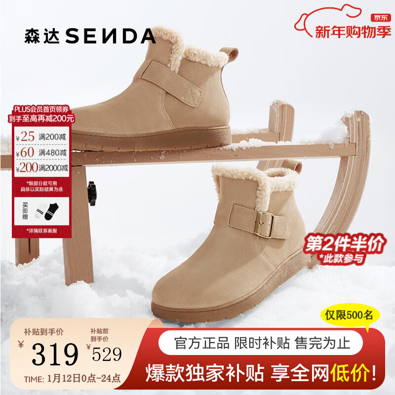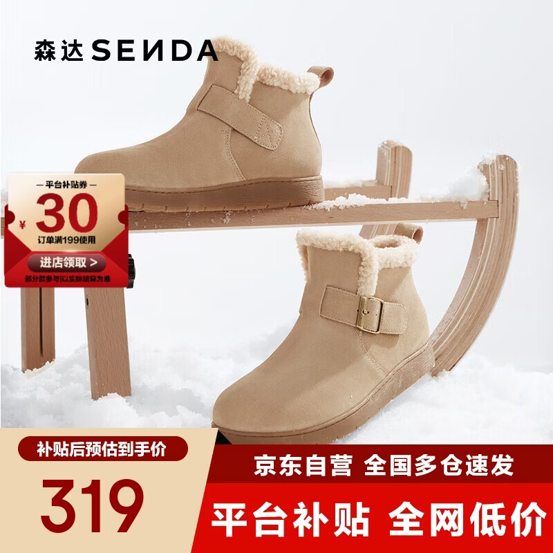 森达雪地靴女子2025春秋新款毛绒保暖勃肯休闲短靴4UR40AD5 杏色 38