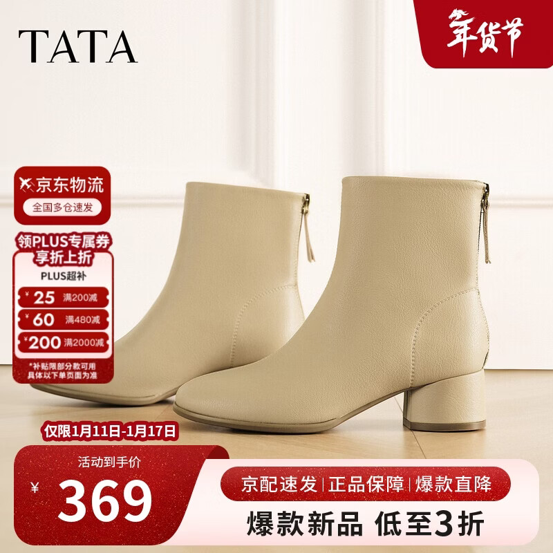 他她(TATA)靴子2025冬商场同款百搭时装靴女短靴粗跟 杏色 37