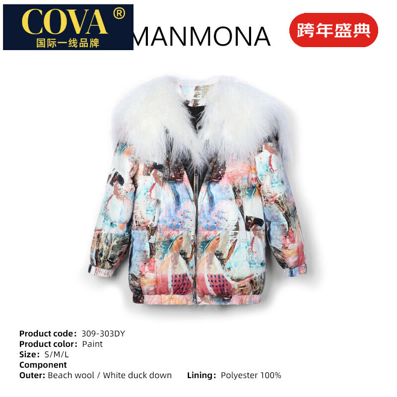 COVA国际一线品牌2025冬季新款进口滩羊毛皮草毛领白鸭绒羽绒服中长款 水墨彩画 S