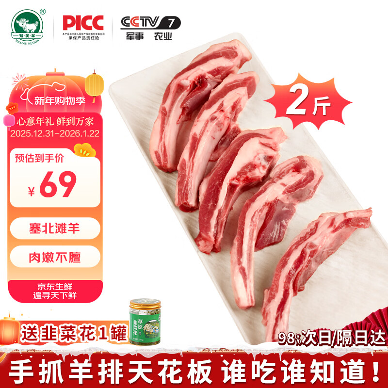 鲜京采宁夏盐池滩羊 羊小排净重2斤 羊排条 羔羊原切羊肉 生鲜烧烤清炖