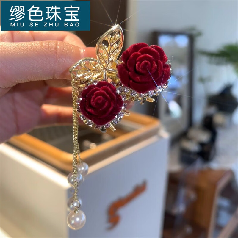 缪色(MiU Se)红色植绒玫瑰花抓夹女秋冬后脑勺半扎红豆发夹子头饰小号流苏发卡 两朵玫瑰花珍珠款A15-101