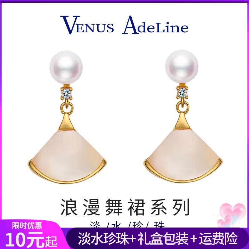 VENUS ADELINE淡水珍珠耳环女银针小裙子扇形贝母耳饰小众耳钉轻奢耳坠生日礼物 金色送女友老婆妈妈闺蜜圣诞节礼