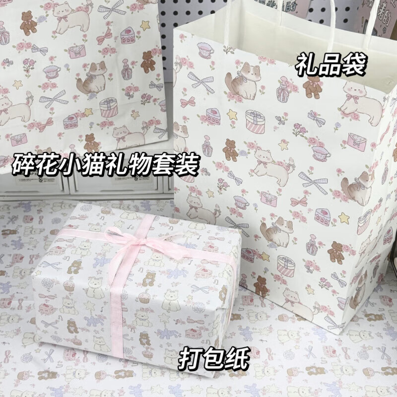 碎花小猫礼物套装礼品袋包装纸大号生日礼品盒礼物装饰卡通包装纸 碎花猫咪礼品袋[1个]