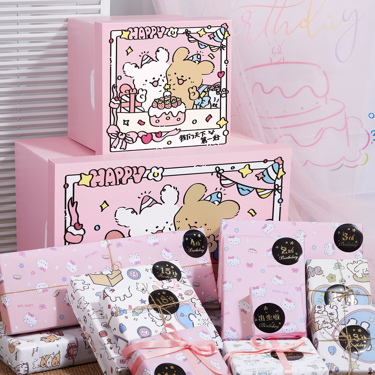 礼美达猫咪KT礼物盒包装纸生日礼盒空盒子礼品包装盒大号纸箱高级送老师 粉色拉菲草+开盖即亮灯+浪漫粉色KT猫包装纸 kitty3号41*41*31(适合装鞋盒/12张包装纸)