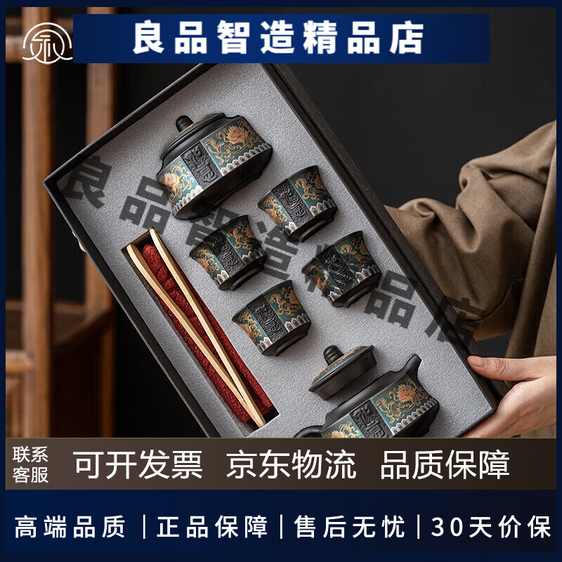 教师节礼物紫砂茶壶套装整套伴手礼商务礼品生日礼物男士 蓝如意缠枝高端礼盒装6头