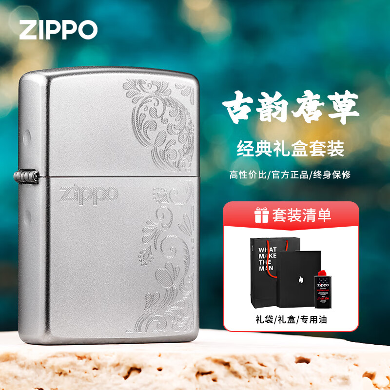 ZIPPO打火机古韵唐草繁花zippo正品芝宝煤油防风火机 男士生日礼物男生 礼盒套装【含油+礼盒+礼袋】