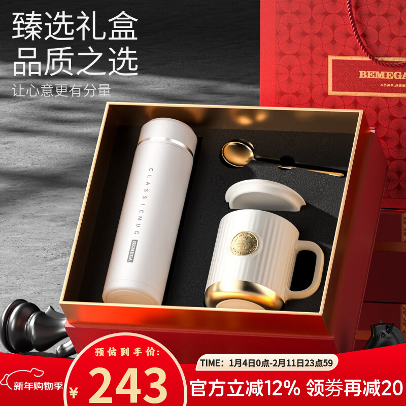BEMEGA高档保温杯女款男2025新款马克杯泡茶水杯子定制礼盒套装生日礼物 优雅白【智能显温陶瓷内胆保温杯+陶瓷马克杯】