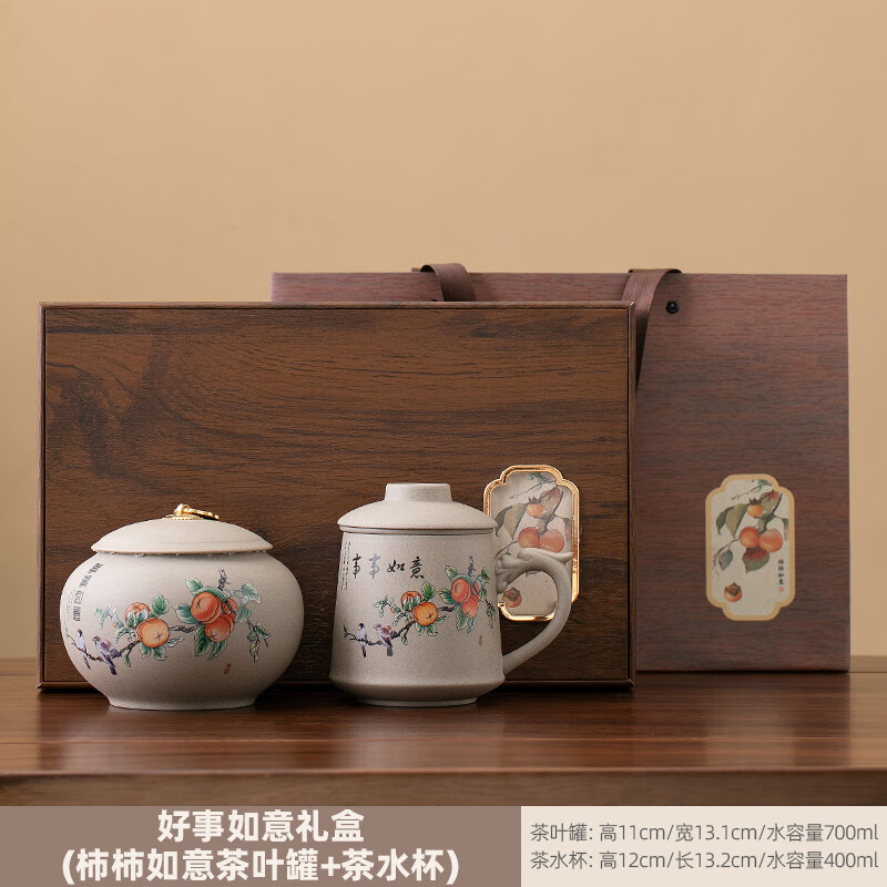 融达高档陶瓷茶叶罐礼盒装空盒包装盒空礼盒白茶红茶铁观音岩茶定制 好事如意礼盒(柿如意茶罐+茶杯)