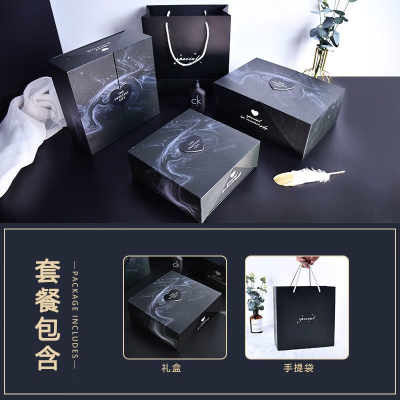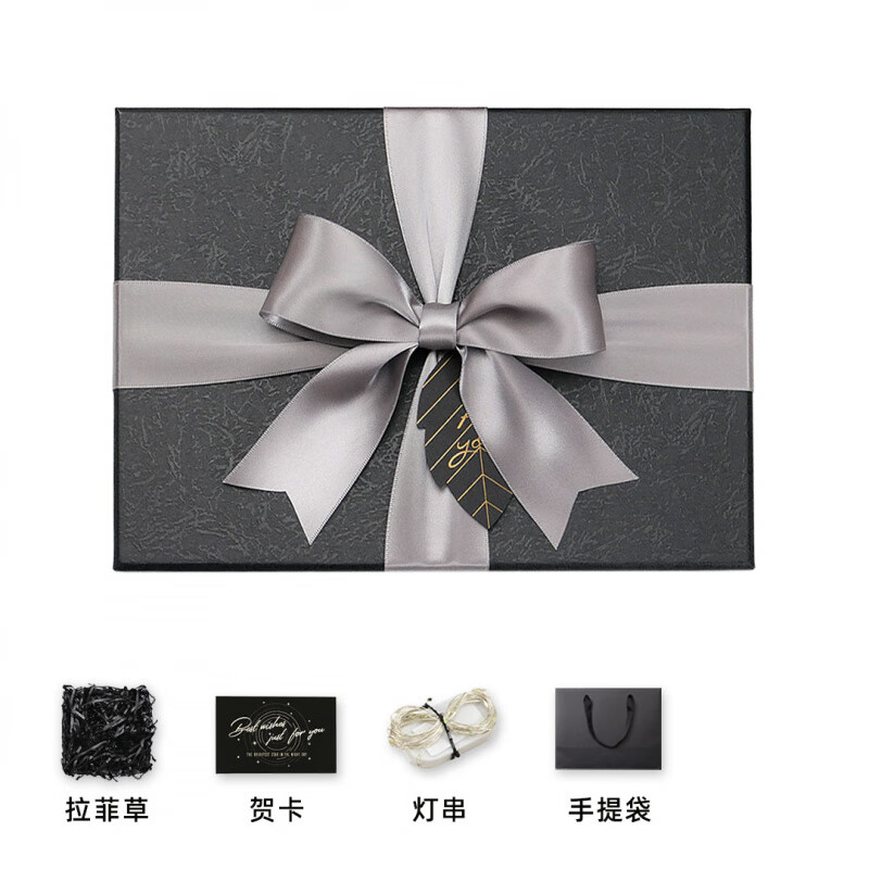 何佳功生日礼物盒黑色感送男生礼盒空盒子大号包装盒轻奢精美礼品盒 黑色盒+拉菲草+贺卡+灯串+手提袋 27x19x8.6cm