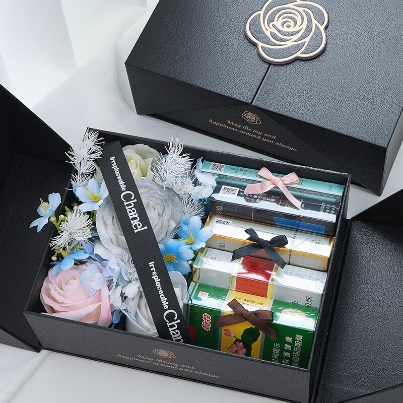 礼美达生日礼物盒伴手礼盒空盒子高级感 香烟花束送男士朋友礼品包装盒 黑金玫瑰3号24*24*9cm+3m丝带+花束 礼盒+拉菲草+开盖灯+黑色礼袋