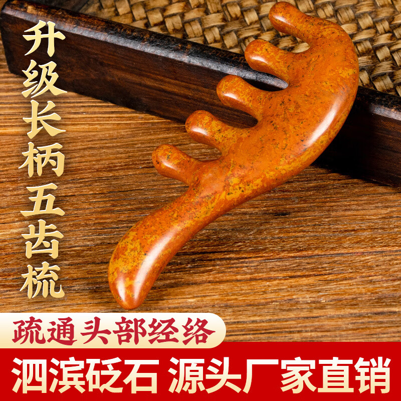 砭石梳 按摩梳子女红砭石头部经络梳五齿头梳防头皮刮痧按摩可点 红砭石长尾梳送袋子+精油+穴位图
