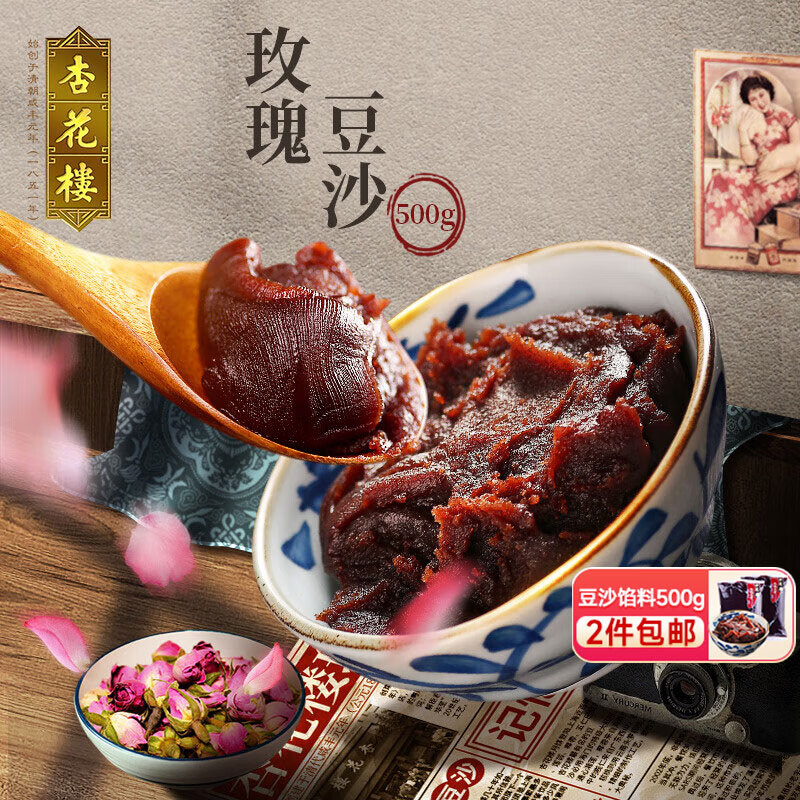 杏花楼中华老字号上海玫瑰红豆沙馅料袋装500g青团汤圆包子烘培糕点原料 【经济2袋】玫瑰豆沙馅料500g*2