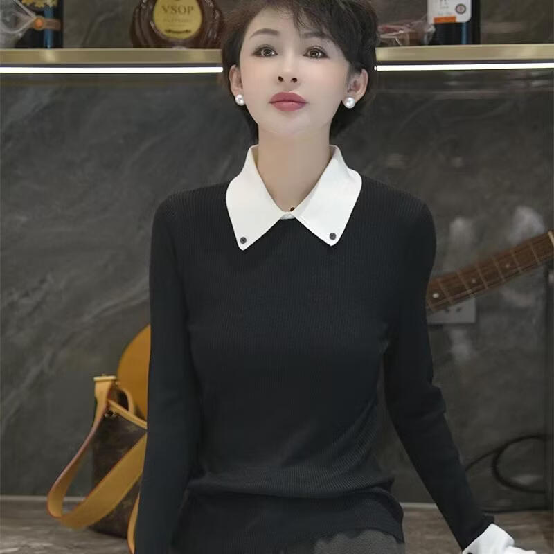 【轻奢品质】气质显瘦翻领百搭针织上衣衬衫领时尚撞色精纺打底衫 藏青色 M (建议90-120斤)