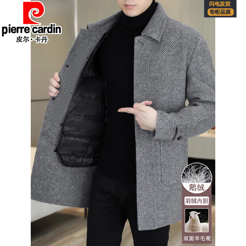 皮尔卡丹(pierre cardin)高端羊毛大衣男翻领脱卸鹅绒内胆复古双面羊绒外套中年爸爸冬装 浅灰色【可脱卸鹅绒内胆】 M 170