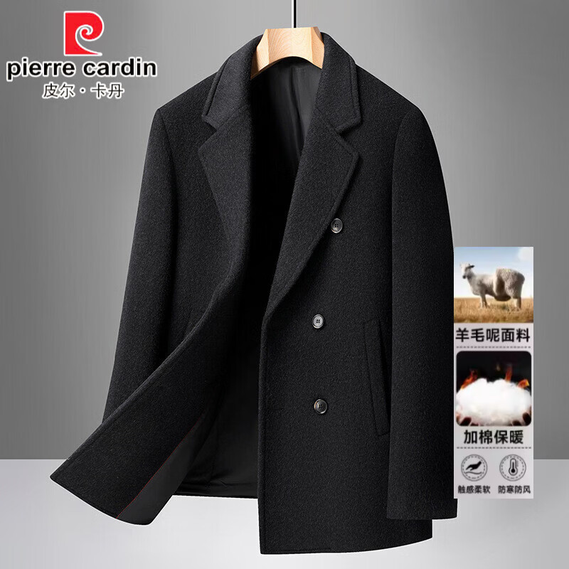 皮尔卡丹(pierre cardin)秋冬双面羊毛大衣男士中长款中年男装纯色翻领单排扣羊毛呢子外套 黑色 M 170