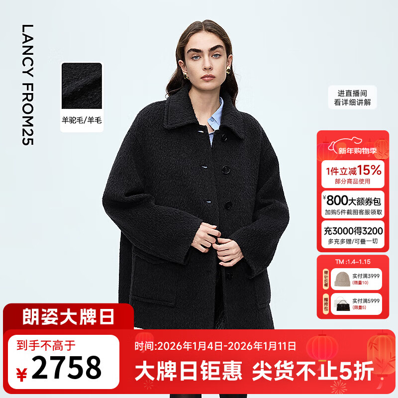 沫晗依美含羊驼桑蚕丝绵羊毛双面呢外套25冬季翻领气质美拉德大衣