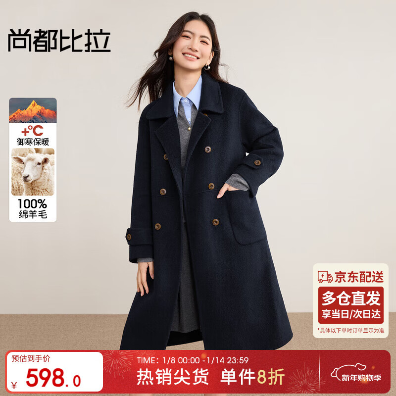 尚都比拉英伦风纯羊毛毛呢大衣女冬季保暖厚款双面呢外套中长翻领宽松大衣