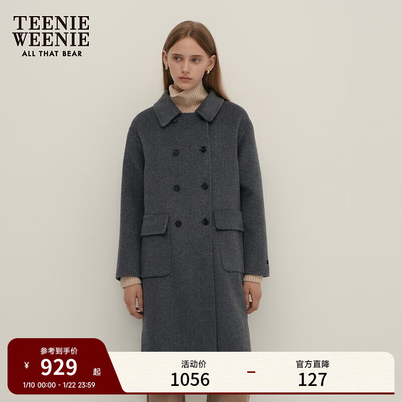 Teenie Weenie【澳毛】小熊女装简约冬装长款翻领双面毛呢大衣外套 灰色 S (160)