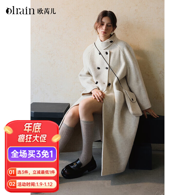 Olrain欧芮儿毛呢大衣女装冬季设计感两穿翻领双面呢子外套羊毛大衣 燕麦色 S
