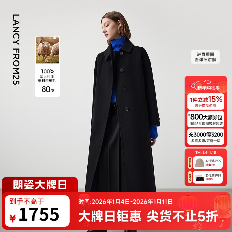 朗姿纯羊毛复古夹克式翻领双面呢大衣冬季新款中长款毛呢外套 黑色 S