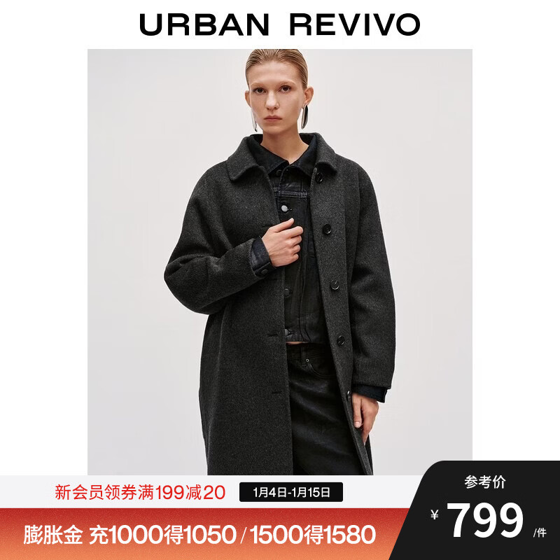 UR2025冬季新款女装翻领超宽松含羊毛大衣呢料外套UWM150075 黑色 S