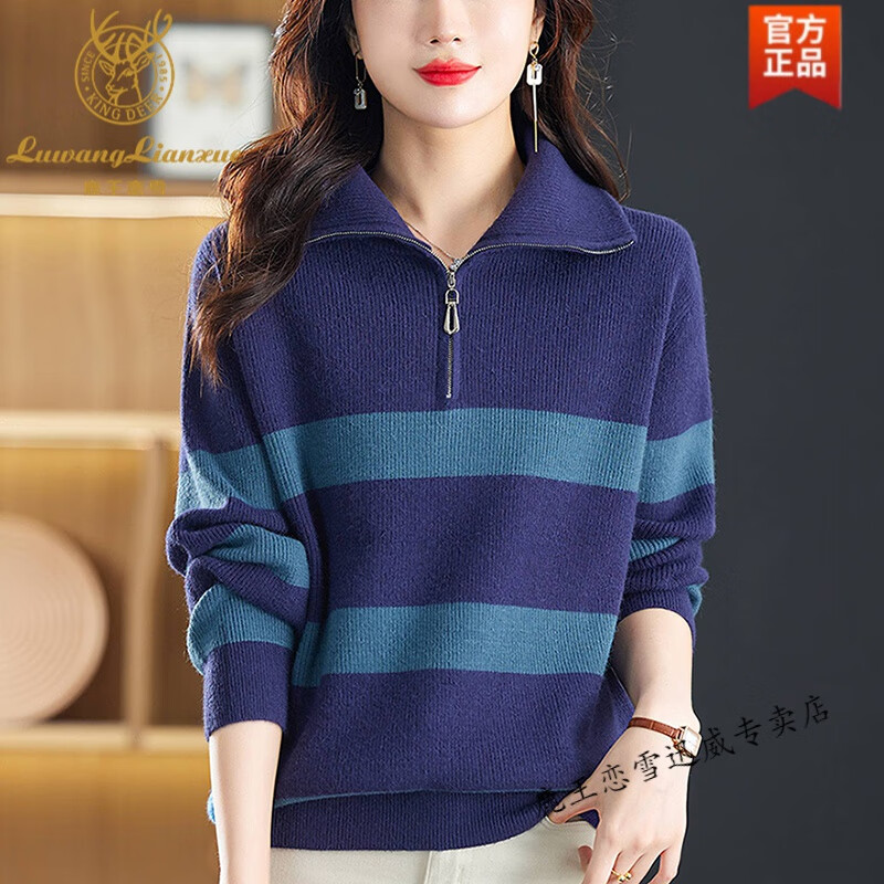 鹿王恋雪品牌半拉链羊毛衫女秋冬休闲外穿加厚毛衣针织衫翻领毛线衣 蓝色 L
