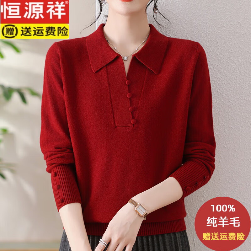 恒源祥2025本命年红100%纯羊毛衫女妈妈装Polo翻领加厚保暖秋冬打底毛衣 酒红 3XL 建议135-145斤