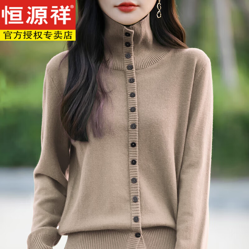 恒源祥2025新款翻领针织衫女士开衫毛衣外套冬季加厚高领羊毛打底衫宽松 驼色 M 80-100斤