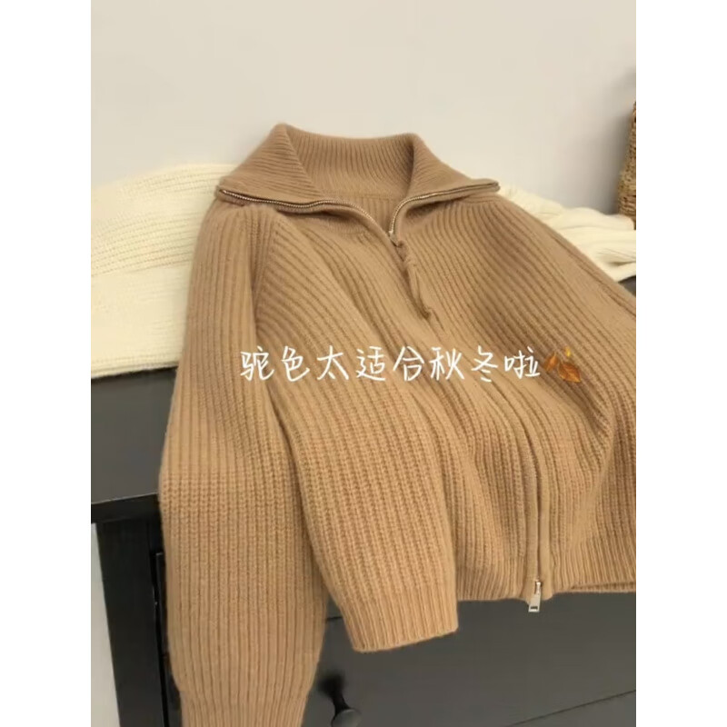 Rindu女秋冬毛衣外套开衫厚款大翻领驼色翻领双拉链针织开衫毛衣外套女 驼色 加厚 S 推荐(85-105斤)